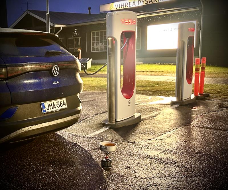 Suomea pohjoisesta etelään päin yöllä matkatessa on hyvä olla varautunut omilla eväillä. Etenkin kun matkaa tekee suunnittelematta sitä lainkaan etukäteen, kuten minä taas tein. Meillä oli onneksi mukana vaellusten takia trangia ja keittoja, vettä sekä eväsleipä tarpeita. Lämmitinkin yhden lataustauon aikana trangialla vuohenjuustoisen tomaattikeiton ja toisen lataustauon aikana keitin trangialla ja mutterilla espessot. Tämä seikka ei tosin ole mitenkään sähköautolla matkan tekoon liittyvä, vaan samat ruokailupaikat ovat avoinna liikkuipa auto millä tahansa liikenne-energialla.