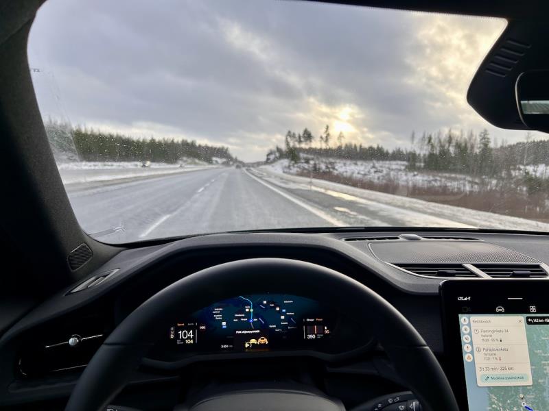 Matka tehtiin talvisia moottoritien 100 km/h rajoituksia noudattaen. Oikea nopeus tarkistettiin navigaattoreilla. Autossa pidettiin mukava lämpö päällä automaattisilla asetuksilla. Käytännössä se tarkoitti +21°C lämpöpyyntiä. Käytin myös jonkin verran testatakseni ilmastoinnin eco-asetusta ja näin leudossa kelissä en huomannut sillä mitään mainittavaa eroa ja ajoinkin jälleen ilman takkia ja kenkiä.