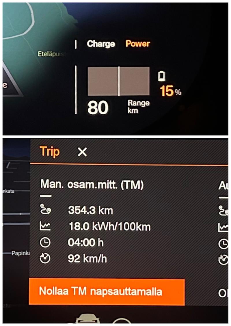 Perillä auton akustossa oli varausta 15 % jäljellä ja autolla olisi ajanut toimintamatkaennusteen mukaan vielä 80 kilometriä. Toimintamatka olisi siis toteutunut tällä kelillä ja näillä nopeuksilla jopa yli 430 kilometrin pituisena.