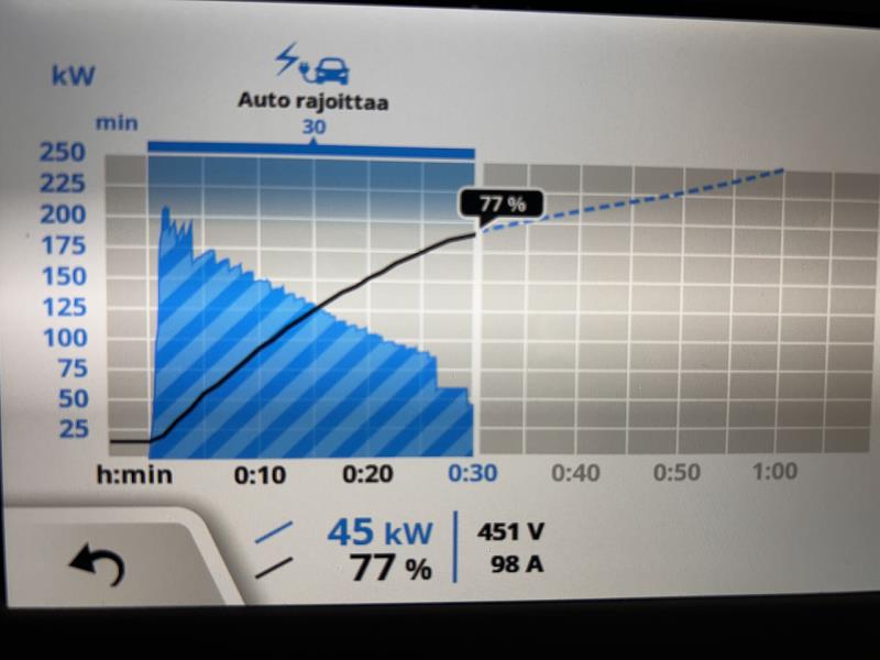 Lataustehon huippu oli 206 kW, eli valmistajan ilmoittama 205 huipputeho käväisi hetken. Myös valmistajan ilmoittama noin 120 kW:n keskiteho 10 prosentista 80 prosentiin toteutui latauksessani 6 prosentista 77 prosenttiin välillä.