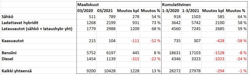 Alkuvuonna sähköhenkilöautoja päätyi rekisteriin Suomessa 1503 kappaletta ja lataushybrideitä 5742 kappaletta. Kaikkien autojen yhteenlaskettu ensirekisteröintien määrä laski samaan aikaan yhden prosentin verran. Prosentuaalisesti katsottuna suurin menettäjä on ollut kaasuautot (-58%), mutta lukumääräisesti bensiiniautot (-1528 kpl). Dieselien lukumäärä (3323 kpl) on jo jonkin aikaa ollut latausautoja vähäisempi.