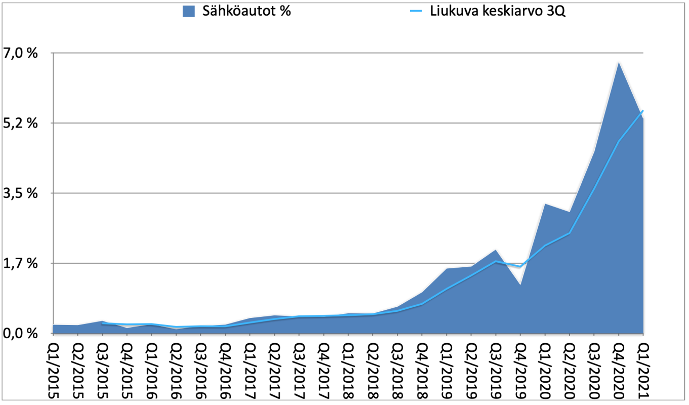 Sähköautot jatkavat edelleen Suomessakin yleistymistään. Vuoden 2021 ensimmäisen neljänneksen aikana ensirekisteröidyistä henkilöautoista 25,9% oli latausautoja, eli lataushybrideitä tai sähköautoja. Sähköautojen osuus oli 5,4%. Edellinen kvartaali, eli Q4/2020 oli niin korkea yksittäinen piikki (6,8%), että nyt palasimme ns normaalimpaan, mutta edelleen erittäin jyrkkään kasvukäyrään. (alla kuvassa kvartaaleittain sähköautojen osuus kaikista ensirekisteröidyistä henkilöautoista.)