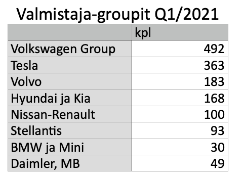 Alkuvuoden aikana rekisteröidyistä sähköautoista Volkswagen Groupin merkit ja mallit ottivat yhteenlaskettuna Suomessa kärkisijan 492 kappaleellaan. Teslan Model3 oli eniten rekisteröity yksittäinen automerkki sekä automalli 363 kappaleella ja merkin alkuvuoden luvuissa huomioitavaa on, että S ja X -mallit ovat olleet malliston uudistuksen alla tuotantokatkolla ja siksi niitä ei ole rekisteröity yhtään kappaletta.