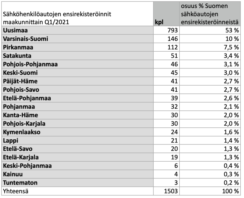 Maakunnittain tarkasteltuna sähköautojen ensirekisteröinnit keskittyvät vahvasti Uusimaa, Varsinais-Suomi ja Pirkanmaa -alueille. Epäilemättä näihin edelleen keskittyy myös uusien autojen ensirekisteröinnit vahvasti muillakin käyttövoimilla toimivissa autoissa.