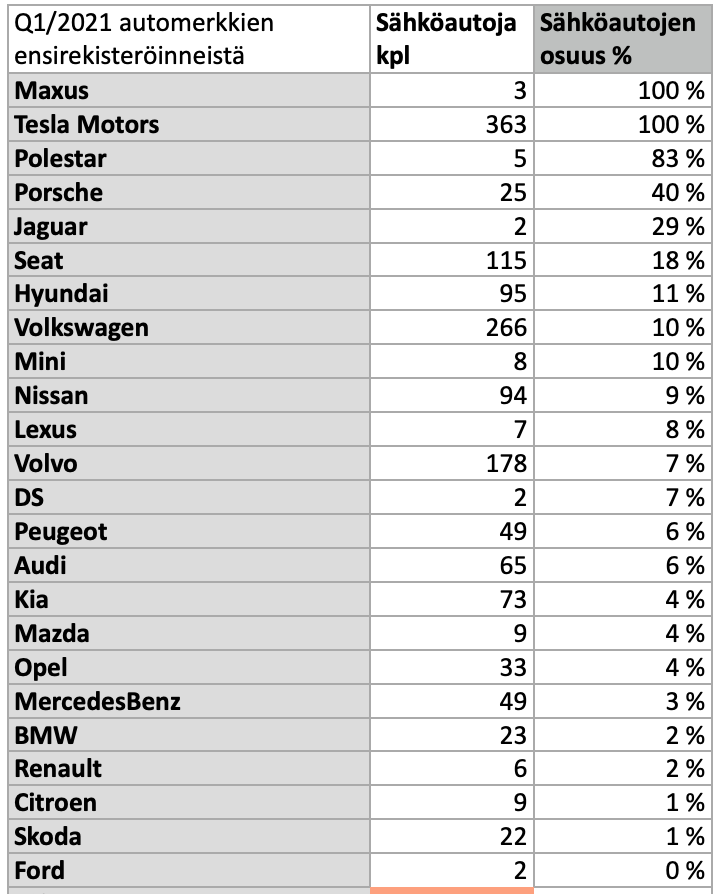 Merkkikohtaisesti tarkasteltaessa tulee vastaan myös mielenkiintoisia havaintoja. Alkuvuoden aikana Suomessa on ensirekisteröity 43:a eri merkkistä henkilöautoa, joista jo yli puolella, eli 24:llä oli sähköautoja. Täyteen 100% sähköautojen osuudesta pääsevät vain Tesla ja Maxus, mutta jo merkittävän korkealle, eli 10% on noussut sähköautojen osuus myös seitsemällä automerkillä.