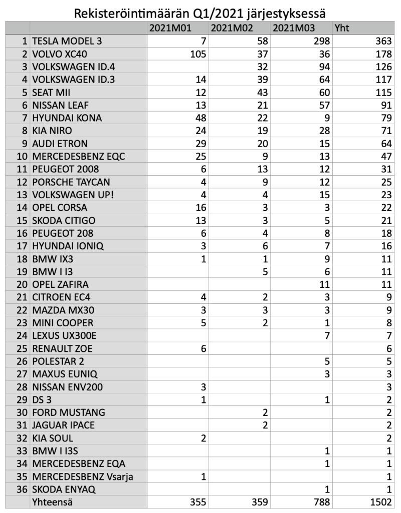 Huomiona, että mallikohtaisen tilaston Q1 yhteensä määrä on yhden auton verran pienempi kuin kaikkien autojen yhteensä tilastossa. Arvelen tämän johtuvan jossain vaiheessa alkuvuotta rekisteröidystä yhdestä Polestar-sähköautosta, joka ei nyt tullut jostain syystä tilastooni mukaan.