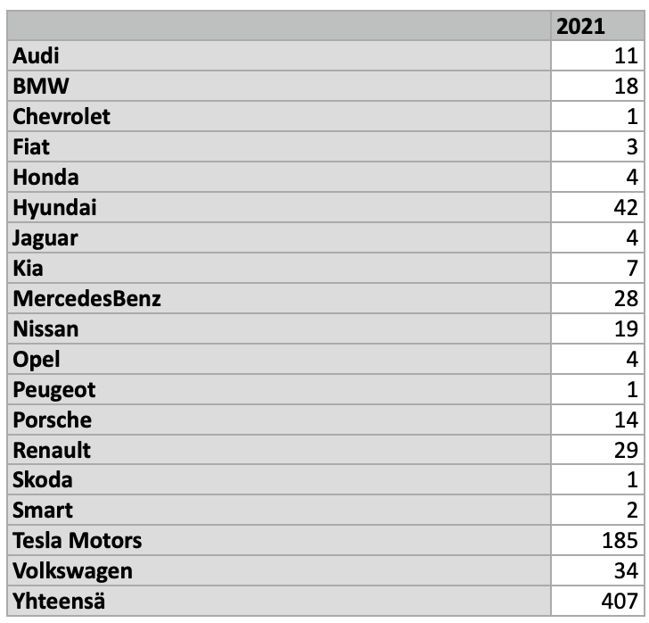 Myös käytettyinä tuodaan kiihtyvällä tahdilla sähköautoja maahamme. Kärjessä ovat Teslat 185 kpl ja Hyundai 42 kpl. Yhteensä käytettyinä on alkuvuonna 2021 tuotu yhteensä 407 kpl käytettyä sähköautoa ja niissä on 18 eri automallia edustettuina. Ladattavia hybridijä tuotiin maahan 2706 kappaletta.