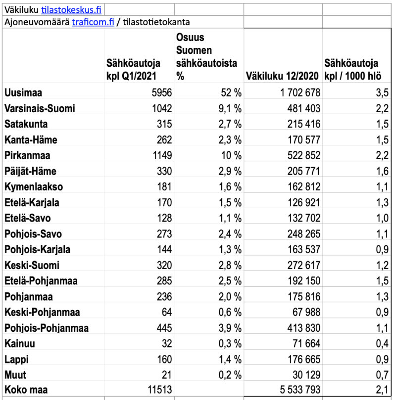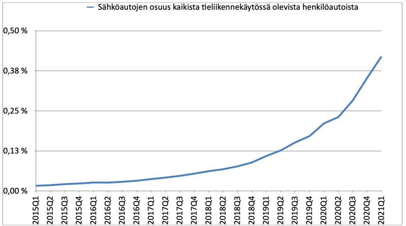 Sähköautojen määrä teillämme kasvaa jatkuvasti. Q1/2021 lopussa maahamme oli tieliikennekäyttöön rekisteröitynä 11 513 kpl sähköhenkilöautoja. (luvussa ei ole huomioitu plugineita ym). Tämän määrän huomaa jo katukuvassa ja pikalatauspaikoilla, vaikka se onkin vasta 0,42% kaikista tieliikennekäyttöön Suomessa rekisteröidyistä henkilöautoista. Sähköautojen lukumäärä kasvoi edellisestä kvartaalista 1816 kpl, kun bensiini- ja dieselautot samaan aikaan vähenivät.