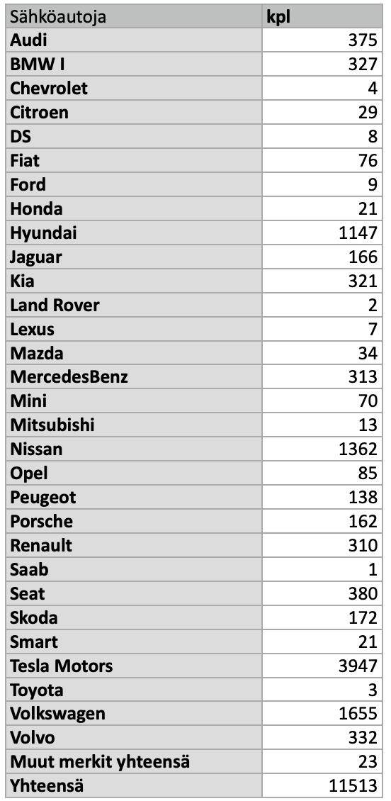 Sähköautoista yleisin on edelleen Tesla 3947 kpl määrällään ja enemmän kuin joka kolmas sähköauto on Tesla-merkkinen. Volkswagen on noussut Nissanin ohitse ja pian saman tekee Hyundai. Volkswagen Groupin merkit yhteensä ovat tehneet todella nopeaa nousua, mutta yhteenlaskettunakin jäävät kakkos sijalle 2744 autollaan.