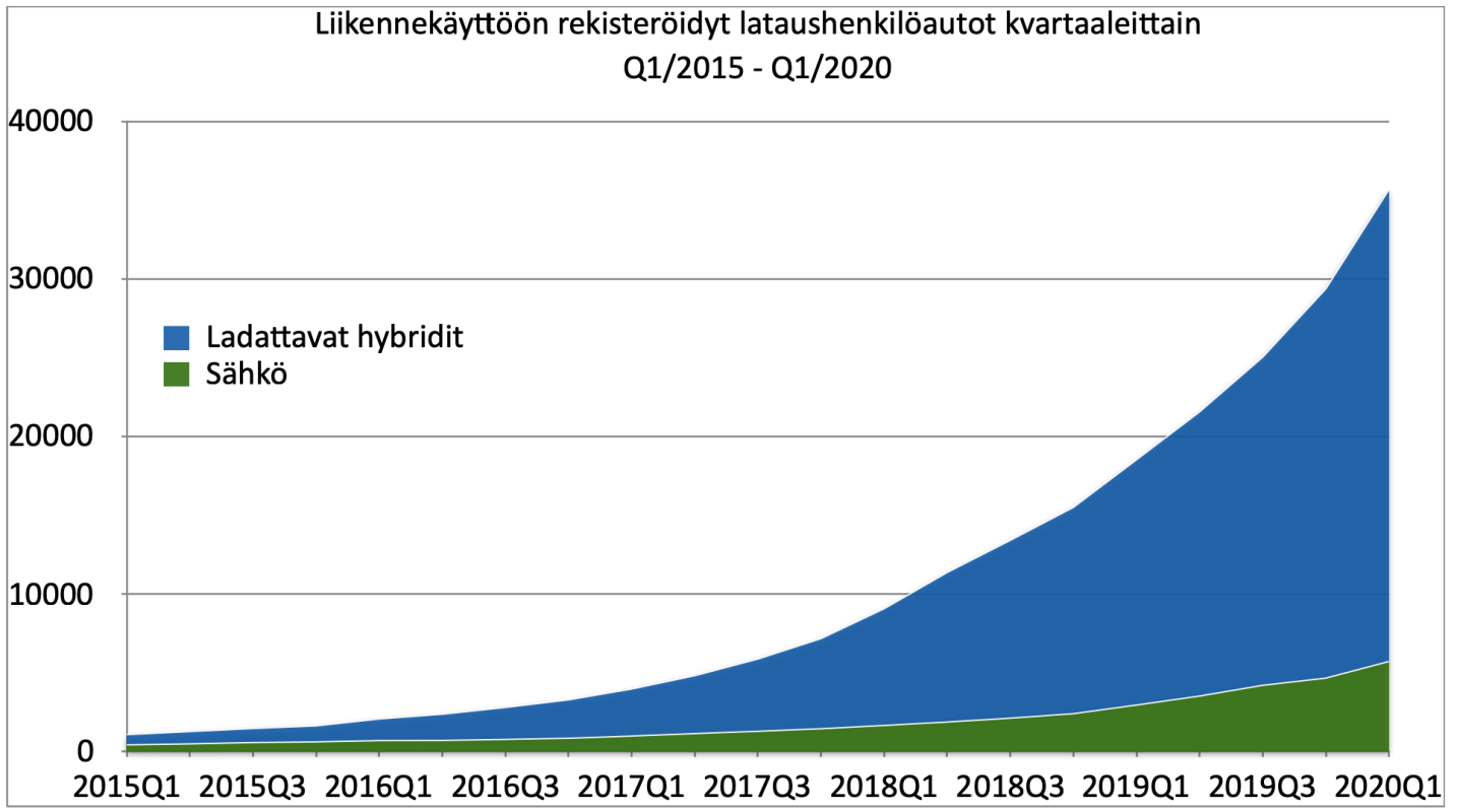 Latausautojen suhteellinen osuus on edelleen pieni, mutta nopeasti kasvava. Q1/2020 latausautot edustivat 1,32% osuutta kaikista liikennekäyttöön rekisteröidyistä henkilöautoista. Sähköautojen osuus oli 0,21%. Osuudet nousevat nyt jyrkkenevällä trendillä ja siihen vaikuttaa uusien ensirekisteröintimäärien voimakas kasvu sekä käytettyjen maahantuonti. Diesel- ja bensiinikäyttöisten henkilöautojen määrä on ollut laskussa nyt kolmen kvartaalin ajan, mutta vaikka vanhimmasta päästä niitä poistuukin tieliikennkäytöstä, niin vastaavasti etenkin dieselien runsas käytettyinä maahantuonti pitää määrää korkeammalla kuin uusien rekisteröinnit antaisivat olettaa.