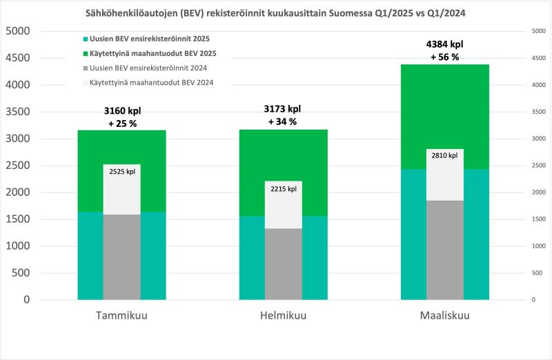 Sähköautojen suosio on ollut rekisteröintitilaston mukaan 2025 vuoden ensimmäisen kvartaalin aikana vahvaa. Vuoden ensimmäisten kolmen kuukauden aikana Suomessa rekisteröitiin yhteensä 10 717 sähköautoa, mikä oli 42 prosenttia enemmän kuin vuotta aiemmin. Rekisteröinneistä 5638 kpl oli uusien sähköhenkilöautojen ensirekisteröintejä ja 5079 kpl oli käytettyinä maahantuotujen sähköhenkilöutojen rekisteröintejä.