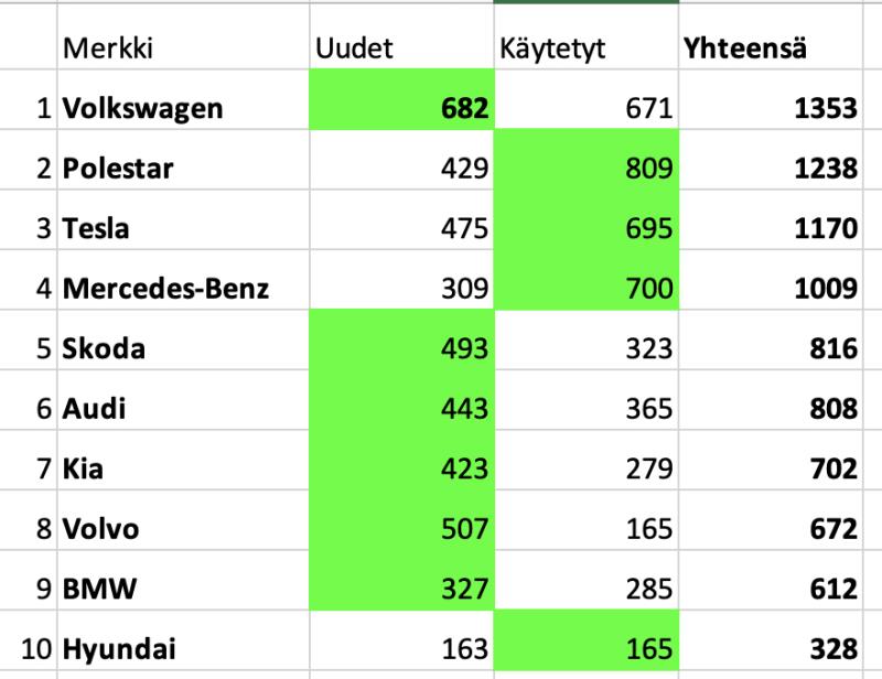 Vuoden ensimmmäisen neljänneksen aikana merkkikohtaisesti eniten rekisteriin on päätynyt Volkswagen-sähköhenkilöautoja, 1535 kpl. Volkswagen oli uusissa eniten ensirekisteröitymerkki. Käytettyinä maahantuoduissa suosituin oli Polestar ja niitä rekisteröitiin uusina ja käytettyinä yhteensä toiseksi eniten, 1238 kpl. Polestarin lisäksi Tesloja, Mercedes-Benzejä ja Hyundaita on rekisteröity enemmän käytettyinä kuin uusina.