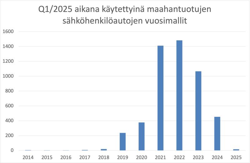 Käytettyinä maahantuotuotuina rekisteröidyistä sähköhenkilöautoista suurin osa oli vuosimallia 2021 - 2023.