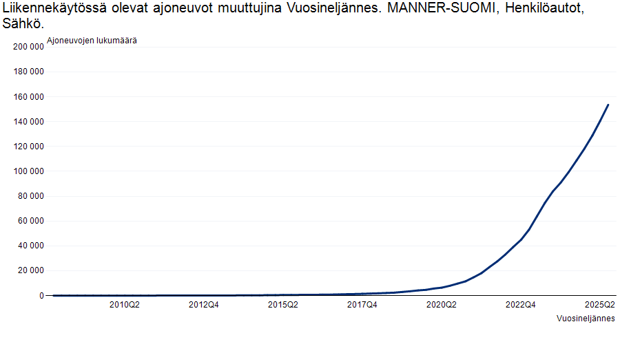 Q3/2025 lopussa Suomessa oli tieliikennekäyttöön rekisteröitynä 153 569 sähköhenkilöautoa (BEV), mikä oli 5,6 % kaikista tieliikennekäytössä olevista henkilöautoista.