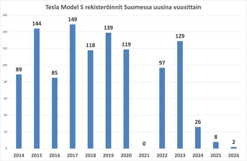 Uusien Model S -autojen ensirekisteröintien korkein piikki on ollut vuonna 2017, mikä on sama vuosi, milloin Model 3 -mallin valmistus alkoi ja sen maahantuonti Suomeen alkoi käynnistyi vuonna 2019. itse arvelen, että Model 3:n ja Model Y:n esittelyt ja myöhempi Highland- ja Uniper -päivitysten parantamat mallit söivät merkin sisällä huomattavasti kalliimman Model S:n myyntimääriä olennaisesti.
