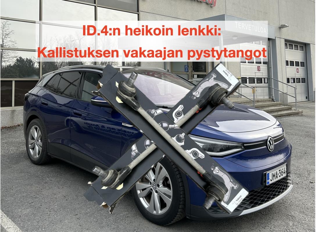 Kallistuksenvakaajan pystytanko taitaa olla tarkempi määritelmä ainakin ID.3:a, ID.4:ää sekä Skoda Enyaqia vaivaavalle heikoimmalle lenkille. Sosiaalisen median merkki- ja mallikohtaisissa ryhmissä olen saanut lukea jopa alle 30 000 kilometrin vaihtovälistä näille osille. Miten uuden auton alustassa voi olla osa, joka kestää noin vähän käyttöä? Alkuperäisosan liitospinta on muovia, joka ei ilmeisesti kestä Suomen kuoppaisia teitä tai pakkasia tai näiden yhdistelmää.