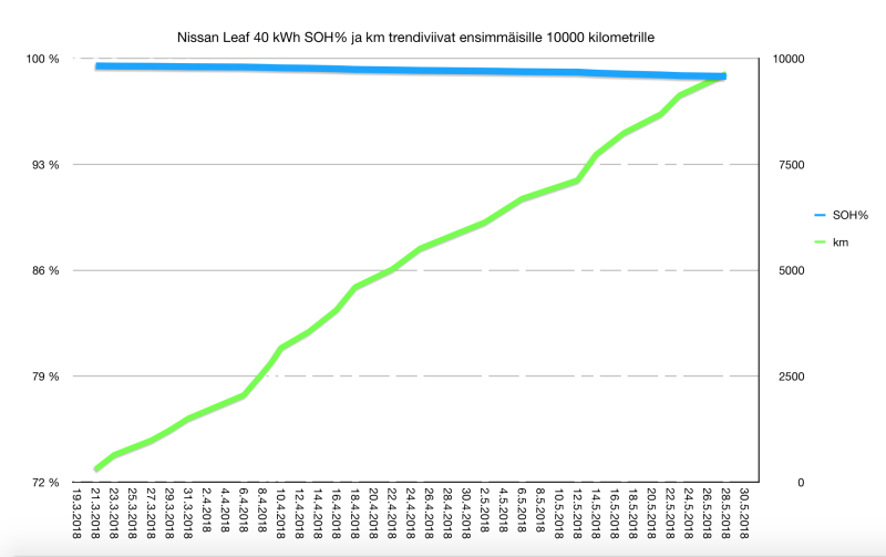 #rapidgate hidastanut kaksi kertaa matkantekoa. Ei siis kohtuuton ongelma sittenkään minullekaan välttämättä. Rapidgaten lisäksi olen pannut merkille, että uuden Leafini SOH%, eli State Of Health, eli akun kuntoisuutta suhteessa uuteen osoittava prosenttiluku laskee tasaisesti, ehkä jopa hiukan kiihtyen. 10000 kilometriä ajetussa autossani SOH on 98,79%, kun se uutena oli 99,52%. En ole tästä laskusta huolissani vielä ainakaan, koska edellisen 24 kWh Leafinikin akun SOH laski noin ensimmäisen puolen vuoden ajan, kunnes nousi takaisi 100% ja pysyi 120 tkm luovutettunakin jopa yli 100% tasolla. Seuraan tuota kuitenkin säännöllisesti mielenkiinnolla, vaikka sillä ei ole vielä ollut mitään havaittavaa vaikutusta täyden akun kWh-lukemaan tai käytännön toimintamatkaan.