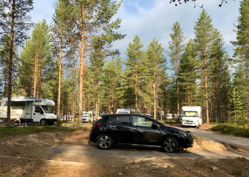 Leirillä olimme neljä päivää. Auto sai sen aikaa seisoa parkissa paria pientä paikallisajoa lukuunottamatta. Noiden käyntien aikana akun varaus laski 97% tasolle, joten en kokenut tarpeelliseksi ladata leirillä autoa lainkaan.