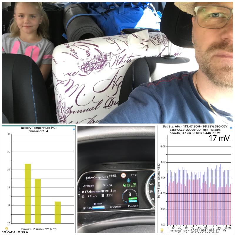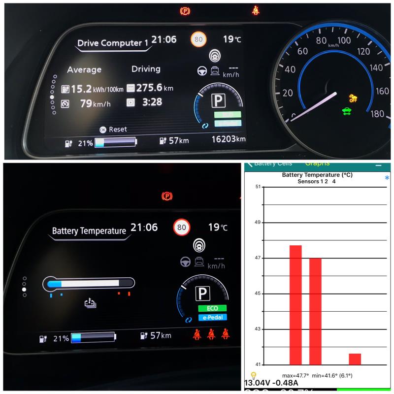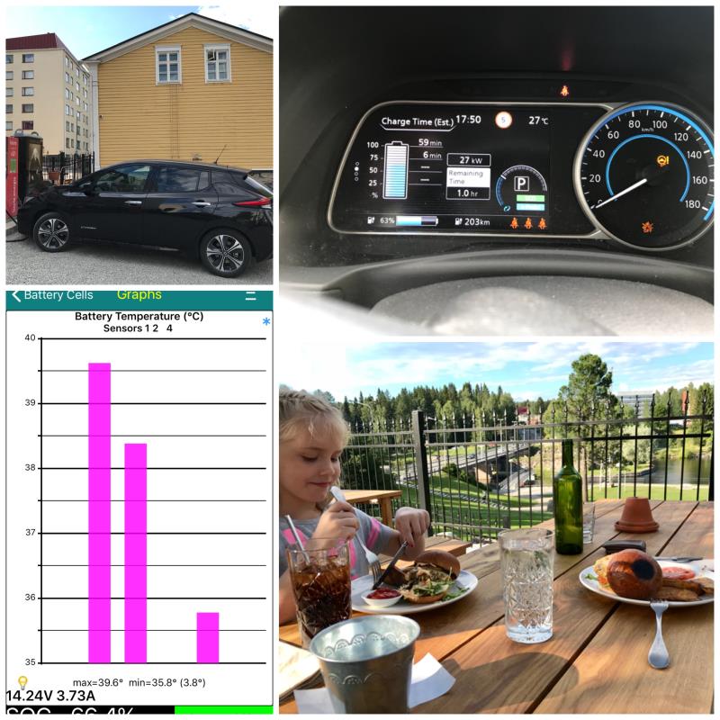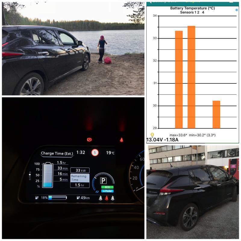 Liikkeelle lähtiessä akussa oli luonnollisesti 100% lataus, mutta ajoakuston lämpötila oli jo valmiiksi peräti 29,3 Cº ja ulkolämpötila vaihteli +25..28 Cº, joten #rapdigate tulisi olemaan edessä jo heti alkumatkasta alkaen. #rapidgate on kansainvälisesti tunnettu Nissan Leaf 40 kWh:n akuston ylikuumenemisominaisuus, joka taasen johtuu puutteellisesta akuston lämmönhallinnasta.n