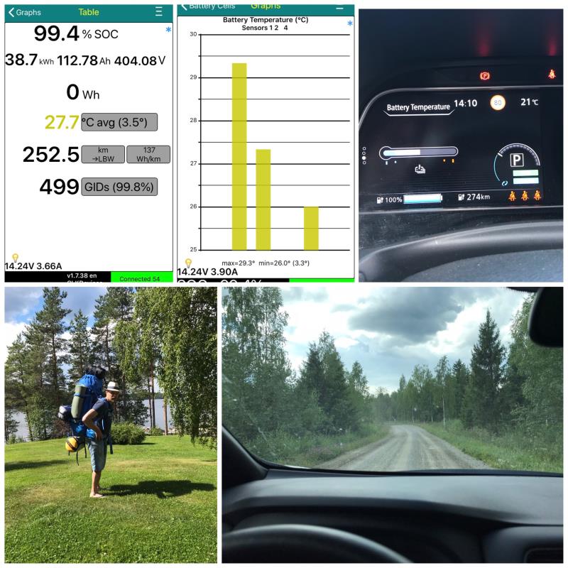 Perjantaina 13.7 pakattiin rinkka leirivalmiuteen ja auto matkailuautomoodiin loppumatkaa varten. Aamulla akku oli taas 100% ladattu ja LeafSpy paljasti akussa olevan 38,7 kWh energiaa ja akkujen olevan jälleen jo valmiiksi helteistä johtuen kovin lämpimät.
