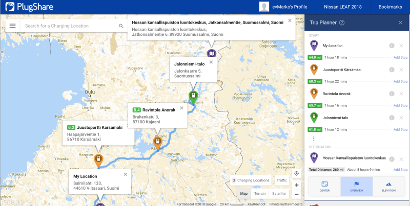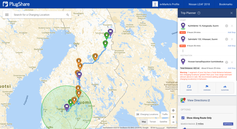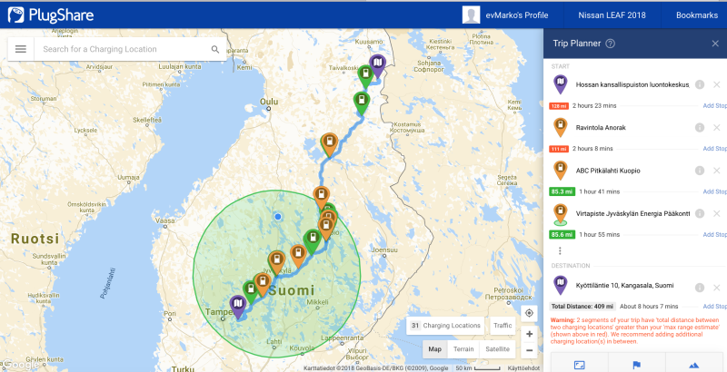 Edelleen 40 kWh Leafillakin on syytä suunnitella näin pitkä matka etukäteen, etenkin kun ollaan menossa kohteeseen, josta ei ole ennestään kokemusta. Itse käytän Plugshare mobiilisovellusta tai internetsivustoa apuna. Hiljattain Plugsharen nettiversioon on lisätty hyvin toimiva reittisuunnitteluominaisuus. Sivusto huomioi autolleni määrittelemän toimintamatkan sekä etsii reitiltä valmiiksi parhaat latauskohdat.