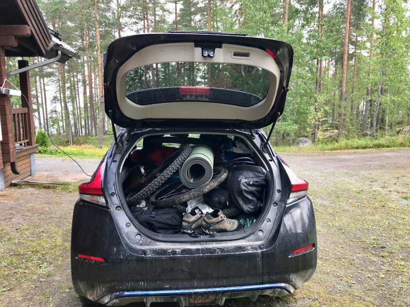 Toteutimme mökillä pakkausmuutoksen ja lastasimme DH-pyöränkin auton takatilaan sisälle. Tällä valinnalla halusin pienentää kulutusta melkoisen pitkällä jäljellä olevalla matkalla sekä ennen kaikkea nopeuttaa tiedossa olevien Type2-lataustaipaleiden matkantekoa, kuten myös #rapidgaten vaikutusten pienentämiseksi. Melko täyteenhän auton takaosa jo tuli, mutta hyvin mahtui kaksi pyörää ja tolkuton määrä tavaraa kyytiin. Joten suunta kohti Muonion Harri Nivaa, jossa meilläkin oli varattuna yöpyminen. Meidän matkamme ei tosin tästä eteenpäinkään tulisi olemaan pelkästään ajamista ja lataamista, vaan myös matkasta nauttimista.