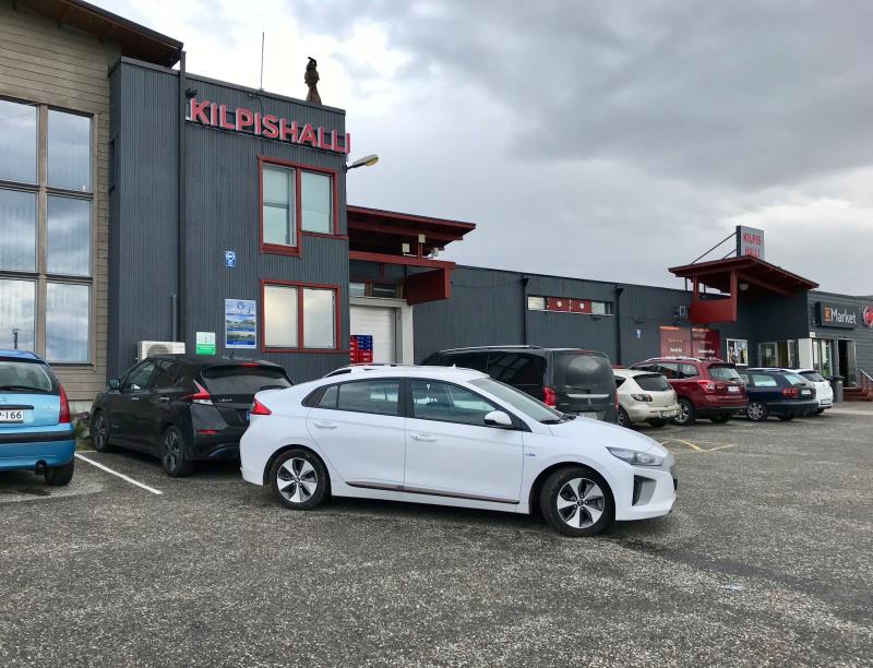 Kilpisjärvellä ajoin Kilpishallin pihassa olevaan Type2-lataukseen ja menimme lounastamaan paikalla olevaan ravintolaan poronkäristystä. Ioniq saapui myös paikanpäälle pian lounastamisemme jälkeen. Kilpishallin pihassa olevat latauspaikat on kuulemma useinkin polttomoottoriautojen pysäköintipaikkoina ja niin oli tälläkin kertaa. Niinpä toteutimme hieman poikkeuksellisen pysäköinnin ja latuaksen järjestelyn. Auto olivat toki koko ajan valvonnassa ja eivät häirinneet mitään muuta liikennettä.