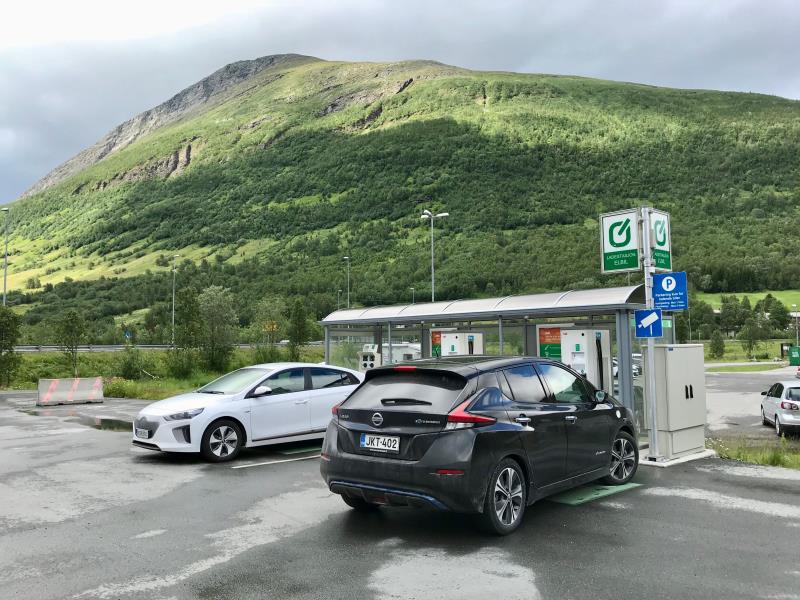Norjan puolella ensimmäinen pikalataus oli kello 17.40 (Norjan aikaa) alkaen Nordkjosbotnissa sijaitsevan Circle K:n pihassa sijaitsevassa Grøn Kontaktin latauspaikasta. Tämä oli samalla myös ensimmäinen kerta, kun olin itse latauspaikassa, jossa oli kaksi erillistä pikalatauslaitetta tarjolla ja aivan vieressä oli myös Fortum C&D:n latauspaikassa toiset kaksi laturia.