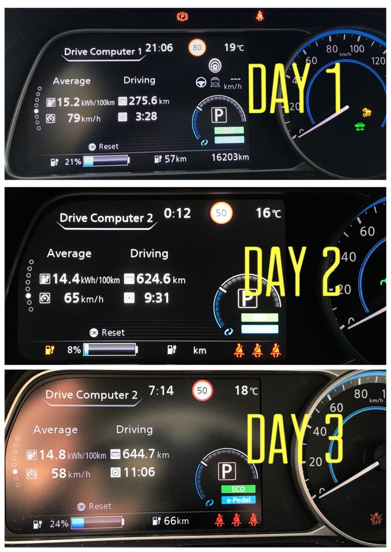 Auton matkamittari näytti lähtiessä 17303 km lukemaa ja LeafSpy kanteli akun olevan 98,13% uudenveroisessa kunnossa. Energiaa 100% ladatussa akussa näytti olevan 37,7 kWh:n verran. Poikkeuksellien kuumasta hellekelistä johtuen akut olivat jo lähtiessä 28C lämmöissä.