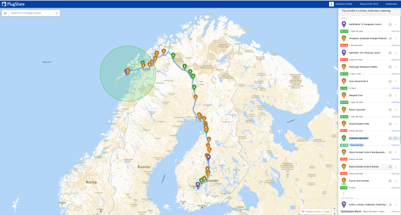 Koko menomatka on sen verran pitkä, että sen saaminen järkevään kuvaan ei ollut mahdollista. Liitän tähän kuitenkin kuvan, jossa on menomatkan reitti ja kaikki pysähdykset. Kuvasta ilmenee myös, että lataussähkön puute ei ole sähköautomatkailun este Helsingistä Lappiin eikä siitä etenpäin etenkään. Eli reitillä näkyy kaikki reitille sattuvat latauspaikat, mutta ei muita. Pellon CD-katveen olisin tosiaan voinut halutessani kiertää ajamalla Rovaniemi-Levi -kautta. Silti tosin Kilpisjärven kohdalle jää yhden Type2-latauksen tarve Leaf 40 kWh:lle.