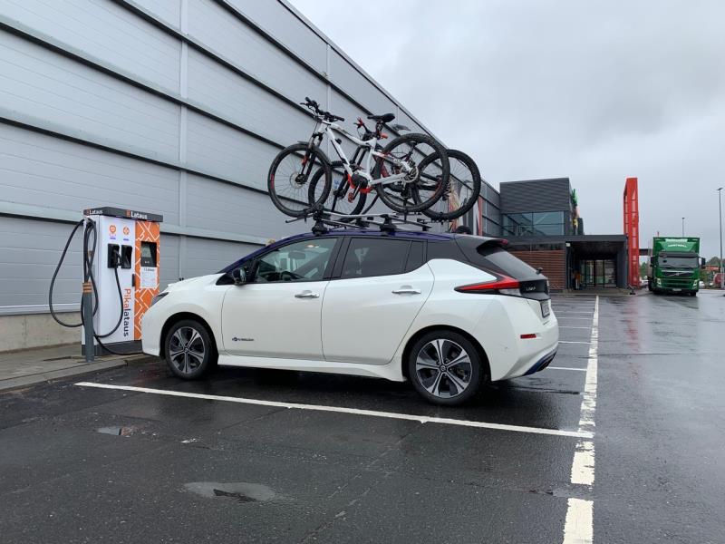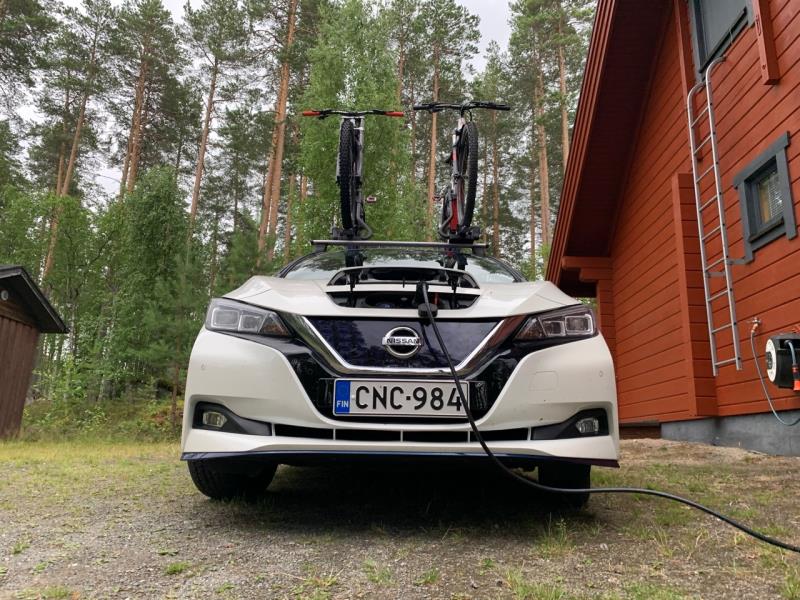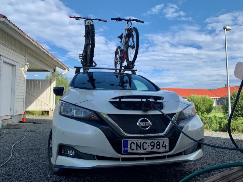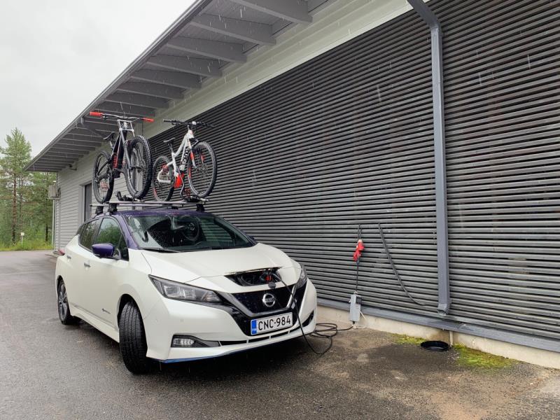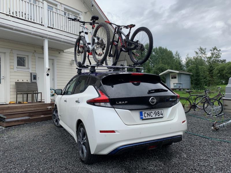 Nissan Leaf e+ -sähköutolla Rukalle kaksi polkupyörää katolla