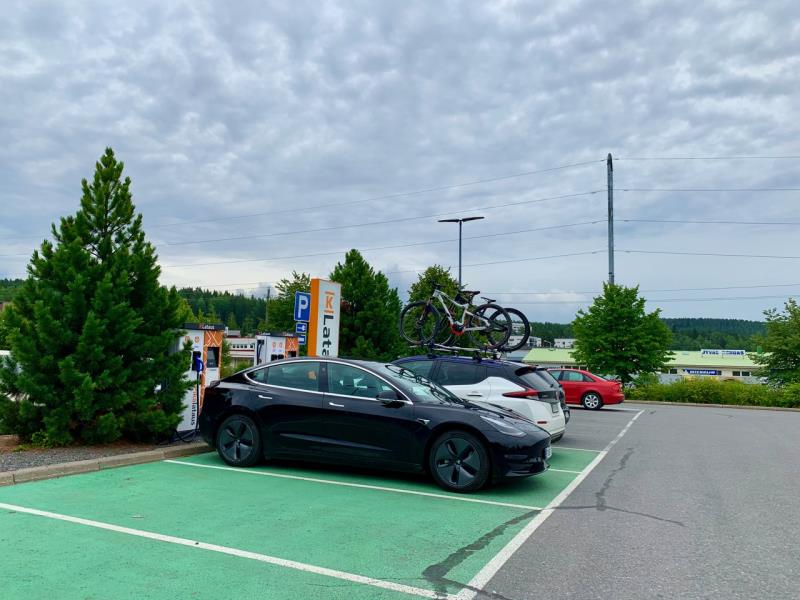 Matkaa Viitasaarta kohti tehtiin Leafilla normaaleita maantienopeuksia käyttäen, kunnes Jyväskylässä pysähdyimme Seppälän alueen K-lataukselle pitämään lyhyen kauppa- ja kahvi- sekä vessatauon. Pikalaturille saapuessa auton näytti akussa olevan 44% varaustason ja 148,8 ajetun kilometrin keskikulutus oli 20,8 kWh, eli sähköä oli kulunut tähän mennessä 31 kWh ja auton käytettävissä olevilla 58 kWh:lla ajaisi noin 278 kilometriä. Tämä välilataus tuli siis tarpeeseen päästäksemme mökille pyörät katolla, koska koko siirtymälle tarvitseisimme noin 62 kWh.