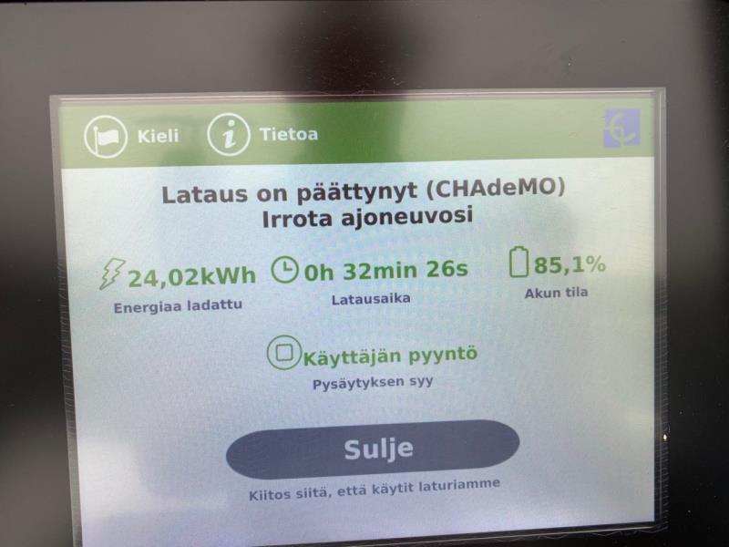- Jyväsylästä kotiin Sahalahdelle ajoa siis noin 150 kilometriä ja akussa vielä varmuusvarakin. Matkaan olisi siis kulunut ajamisen lisäksi noin 2,5 tuntia latailuun pidemmillä nukkumistauoilla.