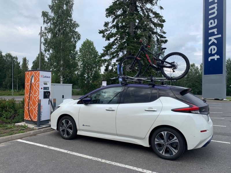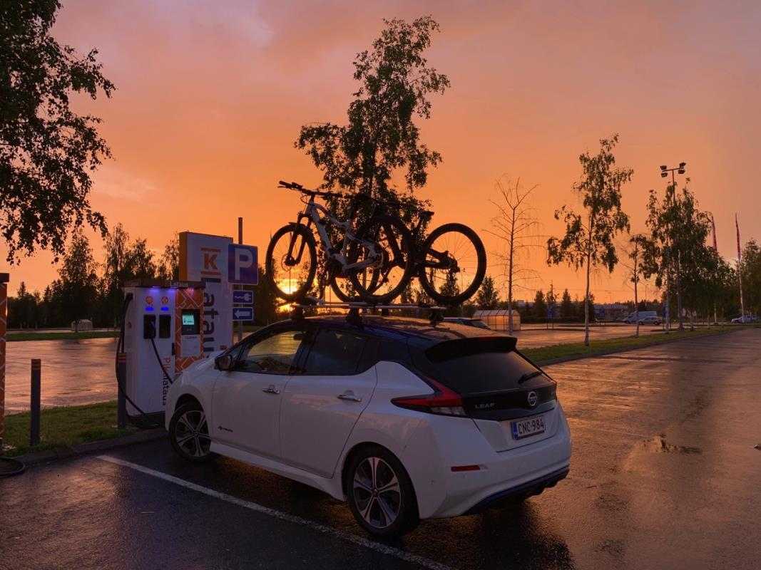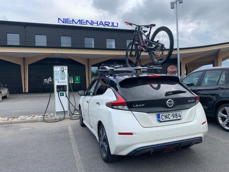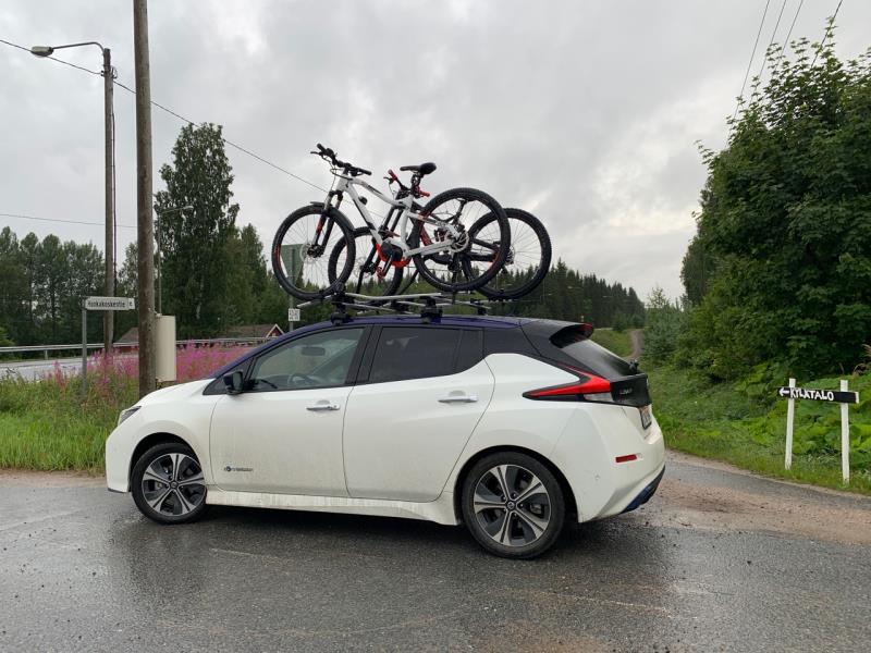 Sopivan haasteen tarjosi tällä kertaa poikani DH-harrastus (Downhillmountainbiking), koska vuoden 2020 SM-sarjan yksi osakilpailu ajettiin Rukan rinteillä. Oulusta Rukalle ei ole vielä kesällä 2020 yhtään pikalatauspistettä ja välimatka on Oulun Ruskon K-lataukselta 236 kilometriä. Tuokaan ei olisi Leaf e+:lle mikään ongelma, mutta kaksi pyörää katolla kasvattavat kulutusta noin 17-20%, joten nyt alettiin saada aikaan haastetta vuoden 2020 sähköautoiluun. Tässä blogitarinassa on kuvaus Rukan matkasta kaksi pyörää katolla.