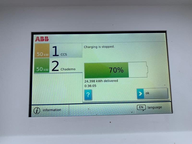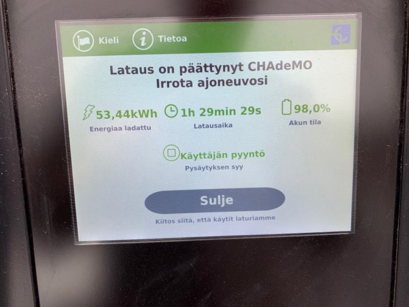 Lataustauolle kertyi pituutta peräti 1 h 29 minuuttia ja siinä ajassa latasin 53,44 kWh sähköä, jonka jälkeen auton akku oli 98% täynnä. Näin pitkää pikalatausta ei kannata tehdä muuta kuin tällaisessa pakkoraossa. Hintaa lataukselle kertyi peräti 17,90 euroa. Lataamisen keskiteho jäi 36 kW:n tasolle, mutta yllätyin silti positiivisesti että noinkin ylös.