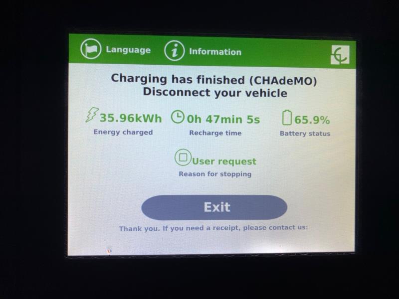 Akku ei ollut vielä kuumentunut käytänössä lainkaan ja sain ladattua 47 minuutin lataustauon aikana 36 kWh sähköä, joten jatkoimme matkaamme 65,9 % täydellä akulla kellon näyttäessä 22.56. Hintaa tälle lataukselle kertyi 9,42 euroa ja latauksen keskiteho oli 45 kW.