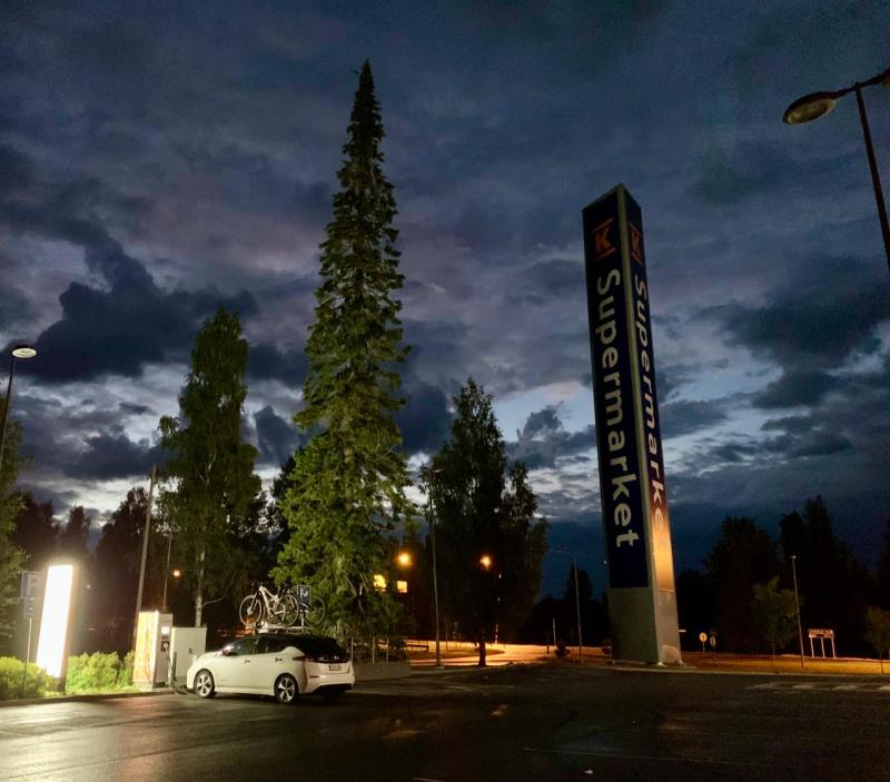 Viitasaaren lähestyessä tein päätöksen käydä hakemassa mökin lähellä olevasta Pihtiputaan Niemanharjun piklaturilta yömyssyt auton akkuun, mutta tämä laturi olikin vikatilassa, eikä toipunut asiakaspalveluun tehdyn puhelunkaan avulla. Onneksi kivenheitonpäässä on K-kaupan pihassa laturi, johon saavuimme kello 18.10 vajaalla miehityksellä auton akun näyttäessa 21% varaustasoa. Miehityksemme vajaus johtui siitä, että DH-kilpailijapoikani halusi ajaa Löytänän risteyksestä sähköpyörällä mökille 9 kilometrin matkan meidän edellä.