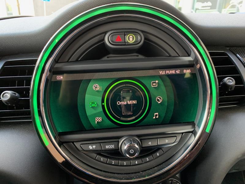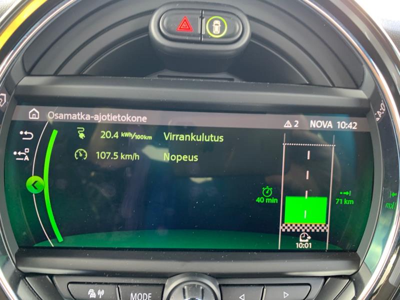Ajotietokoneiden opettelu vei hetken ennen liikkeelle pääsyä, jotta sain nollattua kulutus ja osamatkamittarit seurantaani varten. Samalla totesin, että taidan olla jo sitä iPhone-sukupolvea, joka haluaa käyttää kosketusnäyttöjä. Koen nimittäin nämä useamman näytön ja hurjan nappulaviidakon autot vaikeaselkoisiksi verrattuna Teslan intuitiivisesti käytettävään käyttöliittymään ilman nappuloita. Tämän Mini Cooper SE:n retro-henkisyyteen olisi kyllä sopinut hienosti sekin, että keskellä kojelautaa olevaan isoon pyöreään näyttöön ja HUD:iin olisi keskitetty kaikki näytöt ja tietokoneiden hallinta.