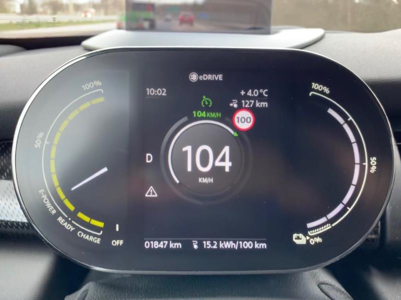 Porvoon suuntaan ja takaisin ajaessani sain tehtyä myös kesäisten moottoritienopeuksien kulutustestin 71 kilometrin edestakaisella matkalla ja yllätyin mielestäni maltilliseksi jääneestä 20,4 kWh/100 km kulutuslukemasta. Keskinopeus tällä testiosuudella totutui 107,5 km/h johtuen kahdesta tietyömaasta ja kääntöpisteen hitaammista risteyksistä, mutta muutoin ajoin koko matkan 120 km/h. Mini kulkisi tuolla kulutuslukemalla kesäistä 120 km/h nopeutta moottoritiellä 141 kilometrin matkan ennen seuraavaa pikalatausta. Se on suunnilleen samaa luokkaa tai jopa vähän enemmän kuin omalla Leaf 40 kWh-sähköautollani toteutuisi vastaavassa kelissä ja nopeudella ajaessa. Hyvin näyttäisi siis Mini onnistuneen taloudellisuusnäkökulmasta sähköautossaan.