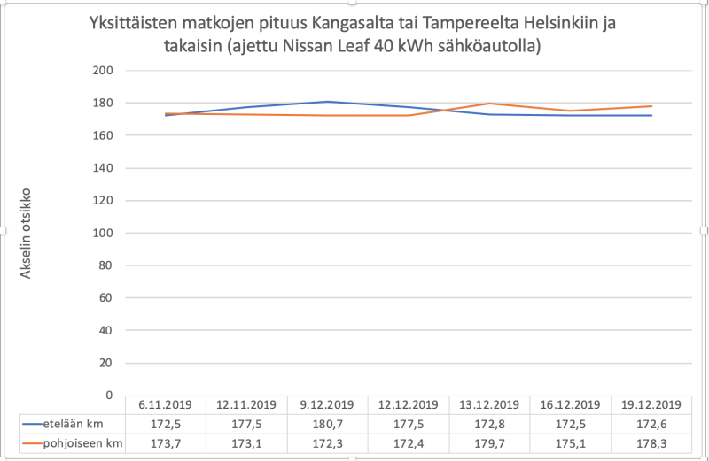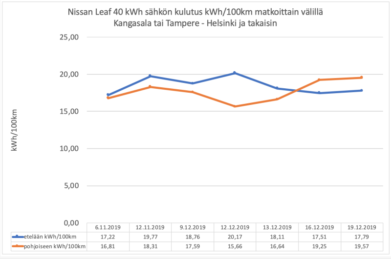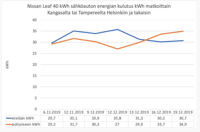 Ajan usein Nissan Leaf 40 kWh -sähköautollani päivän työreissuja Kangasalta tai Tampereelta Helsinkiin ja takaisin. Otin loppuvuodelta 2019 parin kuukauden ajalta toteutuneet kilometrit ja kululutukset Nissanin Carwings -sivustolta ja syötin ne Exceliin nähdäkseni kulutuksen vaihtelua eri matkakerroilla.