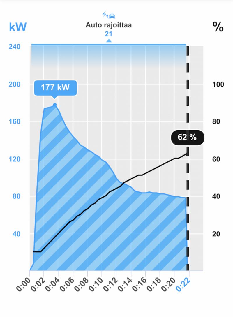 Toisenlaista 400V autojen latauskäyrää näytti esimerkiksi oma edellinen sähköautoni, vuoden 2021 ID.4:n takavetoinen 77 kWh:n versio. Siinä oli latauksen huipputeho edellämainitsemaani Kiaa korkeampi, 175 kW, mutta se saavutettiin vain parin prosenttiyksikön ajan erittäin alkaisilla varausprosenteilla ja sen jälkeen latausteho lähti nopeaan laskuun. Alla yksi ko auton täydellinen latauskerta Norjasta jäämerelta paluumatkalla, missä laturi ilmoitti jopa 177 kW:n hetkellisen huipun ja alle 10 prosentin aloituksen jälkeen akkuu oli 62 prosentin varauksessa ja 21 minuutin latauksen keskiteho toteutui 112 kW:n tasolla.