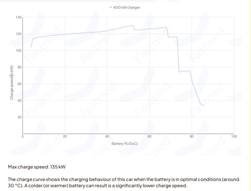 Tämän hetken sähköautojen tarjoamasta otan molempiin otsikkotasoihin esittelyyn ensin korealaisista, koska niissä on tuoreita malleja ja sekä 400V, että 800V akkuisia. Kia EV4 on uudenkarhea malli Suomessa 400V akustolla, ja sitä seuraa pian myös EV5 samaisella akustolla. Auton 81,4 kWh:n akustolle on kerrottu 135 kW:n latatehon huippulukema, mutta keskiteho on 105 kW:n tasoa. Yhdistelmänä nuo edelle kirjoittamani luvut tarkoittavat jo minun kokemuksella erittäin tasaista latauskäyrää, ja Fastned-sivuisto sen vahvistaa ja näkyy kuvassa alapuolella.