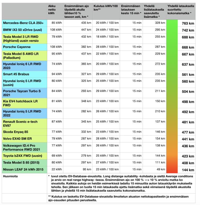 Taulukosta myös ilmenee konkreettisesti se, että pelkästään huipputehokas lataus ei takaa yksinään parasta pitkän matkan suoritusnopeutta. Esimerkiksi Smart #5 jää 400V akkuluokkaan sijoittuvien Teslojen taakse suuren kulutuksensa takia. Saman kaltaisiin ja suuntaisiin tuloksiin ovat päätyneet useammatkin esimerkiksi 1000 km suoriutumisnopeuksien ajokokeet Suomessa ja ulkomailla. Pian saatamme nähdä kuitenkin uudentasoisia suortuksia kärkipäässä, kun CLA ja tuleva BMW i3 tulevat suorituksiaan tekemään.