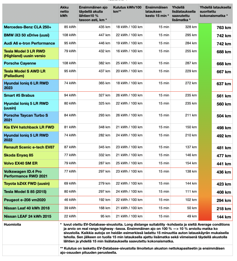 Osalle meistä sähköautoilijoista pitkän matkan hyvä suoritusnopeus on tärkeä asia, kun pitkien matkojen osuus ajoprofiilissa korostuu. Kun sähköautolla haluaa ajaa pitkiä siirtymiä nopeasti, on suorituskyky kolmen tekijän tulos: Akuston käytettävissä oleva nettokapasiteetti (kWh), auton pieni kulutus etenkin suuremmilla nopeuksilla (kWh/100) km, sekä hyvä latausteho (kW) ratkaisevat yhdessä. Keräsin tässä blogikirjoituksessani mainitsemiani sähköautoja, sekä muutaman muun oheiseen taulukkoon ja lisäsin EV-Database -sivustolta niille tietoja, millä pysty hahmottamaan todennäköistä toimintamatkan totutumista Suomessakin normaalissa maantieliikenteessä ja tyypillisessä Suomen kelissä, jolloin ei ole +20 °C ja auringonpaistetta, mutta ei myöskään mitään -25 °C tai kovempaa pakkasta. Omalla runsaalla sähköautoilun kokemuksella tuo EV-Database -sivuston kohta on ollut yllättävän kuvaava ja lähellä aitoa toteutumista verrattuna moniin omiin ajoihin eri autoilla.