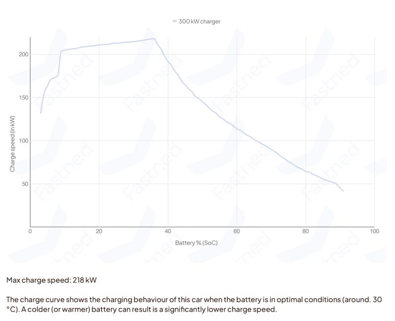 Tesla Model S LR ja Plaid (Palladium) autot taitavat edustaa tähän sarjaan niputtamistani lataustehon kärkipäätä ja kuten alla olevasta Fastnedin kuvasta näkyy, saavuttaa auto 300 kW:n laturissa 218 kW:n huipputehon jonkin verran alle 40 % varaustasolla ja sen jälkeen latausteho lähtee laskuun. Lisään vielä, että ilmeisesti Teslan omalla laturilla nämä saisivat vielä suuremman lataustehon.