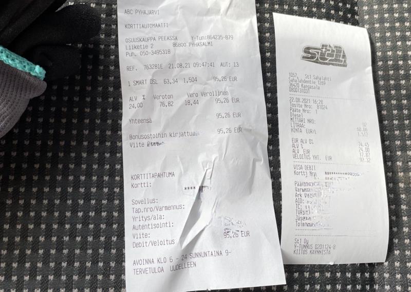 - Pakuun tankattiin Pyhäjärven ABC:lta 63,34 litraa dieseliä, joka maksoi 95,26 euroa. ID jatkoi perille Ouluun ilman latausta.