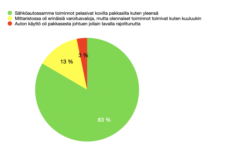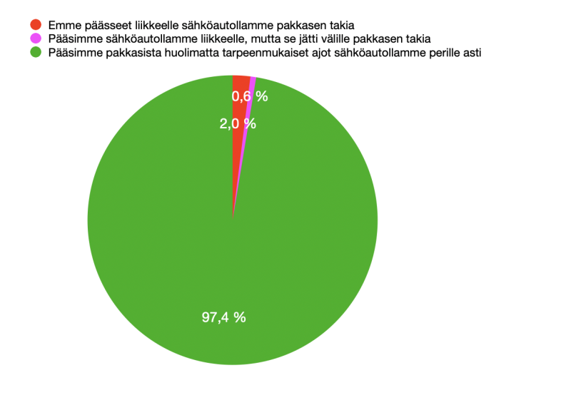 40 vastaajaa eli 2 % vastajista ilmoitti, että matka ei sähköautolla alkanut ensinkään pakkasten takia. 13 vastaajaa, eli 0,7 % ilmoitti, että auto lähti liikkeelle, mutta jätti välille. 97,4 % kertoi auton vieneen pakkasista huolimatta tarpeenmukaiset ajot perille asti.