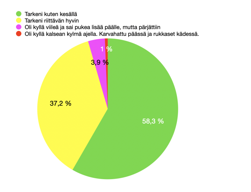 Vastaajista 58,3 % koki, että auto on yhtälailla lämmin kuin kesälläkin. Vastanneista 37,2 % koki, että ei ehkä yhtä lämmintä kuin kesällä, mutta riittävän hyvin tarkenee. Nämä kaksi yhteensä laskien, eli noin 96 % koki, että tarkeni riittävän hyvin, mikä on jopa yllättävän paljon. Vain hieman yli 4 % vastasi joutuneensa pukemaan enemmän tai vähemmän lisää tarjetakseen sähköautossaan.
