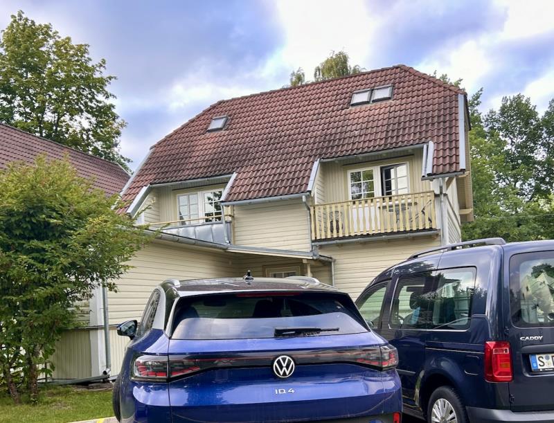 Pärnussa majoituimme vanhan puutalon yläkertaan. En ollut edes yrittänyt saada latausta majapaikkaan, koska Virossa tulee niin vähän kilometrejä ja latauspaikkoja siellä riittää. Latasin autoa hetken Coop-kaupassa asiointimatkan reitillä Pärnun laitamilla olevalla Circle K:n latausasemalla käyttäen Circle K:n mobiilisovellusta. Lataussähköllä oli hintaa täällä 45 snt/kWh.