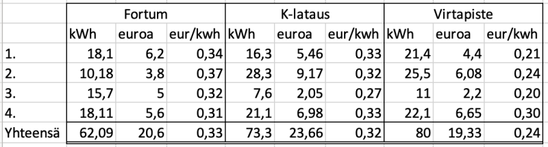 - Ajan Nissan Leaf 40 kWh:llani Tampereelta työkeikalle Raumalle 140 kilometrin matkan talvisäässä. Lähtiessä akku on 100% täynnä. En lataa kertaakaan matkalla ja laitan kohteessa auton saamaan latausta Virtapisteen operoimasta Type2-latasasemasta. Työpäivän aikana auton akku latautuu takaisin 100% tasolle ja akkuun menee 27,5 kWh:n verran energiaa ja hintaa kertyy 4,4 euroa, eli 16 senttiä / kWh. Ajan takaisin kotiin ja laitan auton latautumaan 20 senttiä/kWh hinnalla type2 latauslaitteen Tampereella ja lataan 27,3 kWh, eli täyteen asti ja hintaa kertyi 5,47 euroa. (kaupunkiasunnossani ei ole kotilatausmahdollisuutta, mutta parin sadan metrin päässä on Virtapisteen Type2:sia). Hintaa 280 km työmatkalle kertyi siis yhteensä 9,87 euroa, eli noin 3,5 senttiä kilometriä kohden. Aika hyvin jää ajoneuvon kuoletuksiin jos siis ajaa kilometrikorvauksilla. Keskikulutus tuolla työkeikalla muuten toteutui 19,6 kWh/100km, koska keli oli loskaisena raskas sähköautolle. Koko matkan aikana kumpaankaan suuntaan ei kulunut yhtään ylimääräistä aikaa siihen, että alla oli sähköauto.